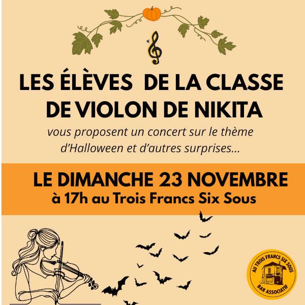 La classe de violon de Nikita a le plaisir de vous convier à une audition de ses élèves au Trois Francs Six Sous. Les élèves exploreront le thème d'Halloween en musique, et seront accompagnés par le quatuor Tutti Quanti. Un joli dimanche d'autonome en perspective !